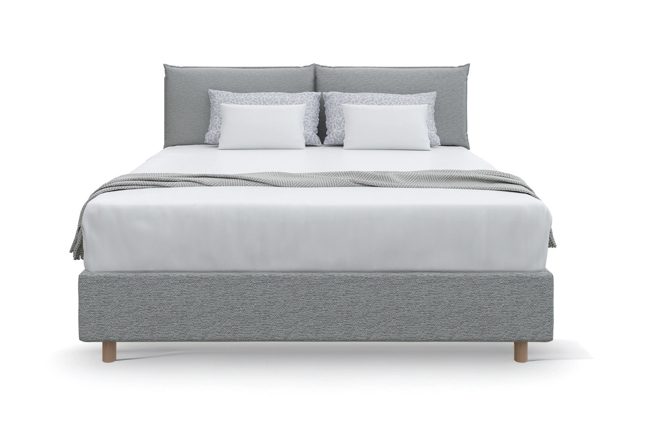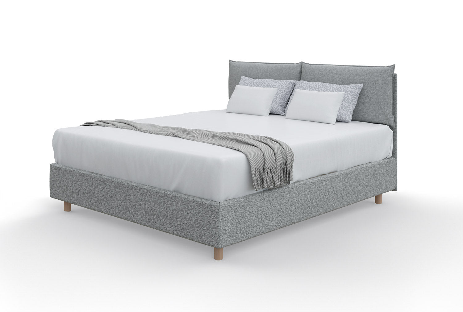 Κομψό κρεβάτι ιταλικού σχεδιασμού, εξοπλισμένο με αποθηκευτικό χώρο, προσκέφαλο με ύφασμα, βάση στρώματος, μηχανισμό ανύψωσης και μαξιλάρια (περιλαμβάνονται).